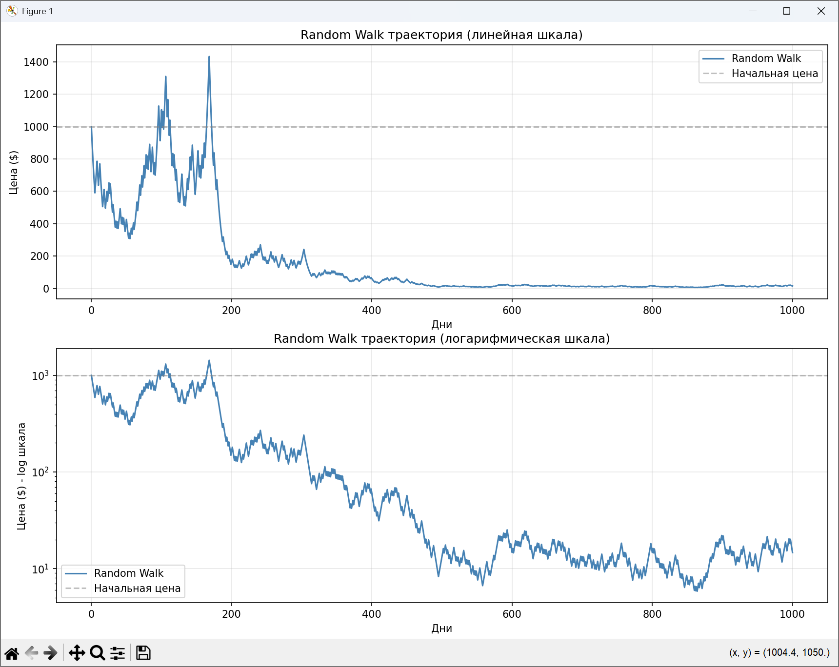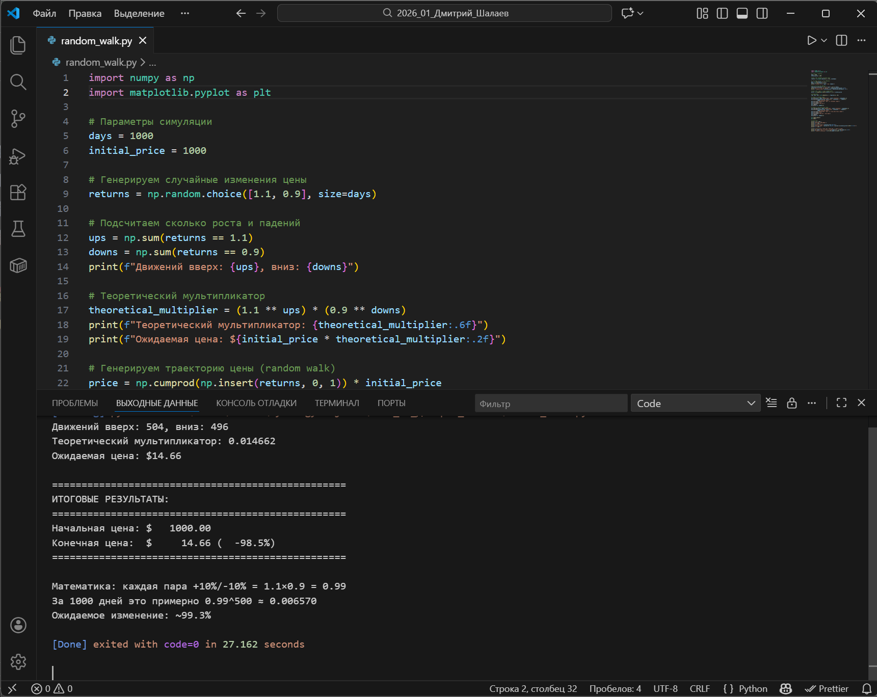 Чтобы самому разобраться в этой теме и по наводке Дмитрия Шалаева я провел симуляцию и создал «токсичный» актив — случайное блуждание, которое математически запрограммировано на уничтожение капитала (те самые +10% / -10%). Это не стратегия для немедленного применения, а демонстрация принципа.